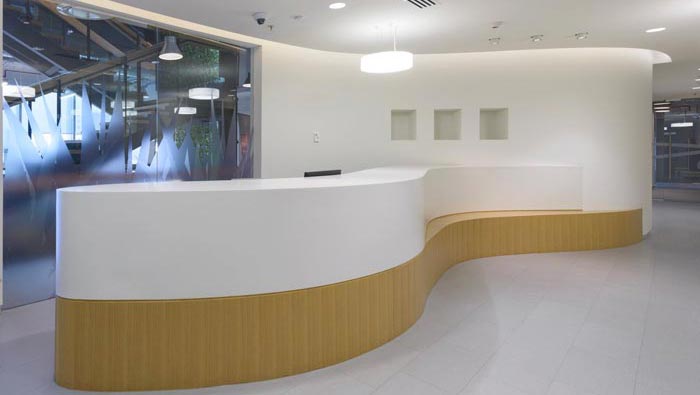 前臺(tái)的設(shè)計(jì):進(jìn)入空間之后首先看到的就是流線型的設(shè)計(jì),這是設(shè)計(jì)師根據(jù)空間的特性所設(shè)定的,同時(shí)前臺(tái)的設(shè)計(jì)也有指引的寓意在其中,波浪形的外型清楚的向人指引著前進(jìn)方向,波浪總是一浪還比一浪高,寓意著企業(yè)如竹子花開(kāi)一樣節(jié)節(jié)攀升。