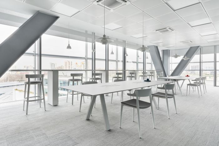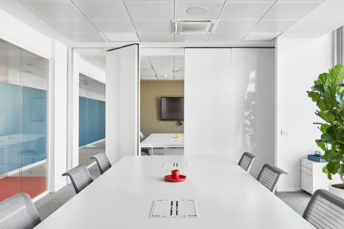 設計師在新的辦公室中劃分了包括用于非正式會議的工 作區、配備視頻會議的會議室。獨立會議室、項目室、圖書館和專門用于一對一會議和重點活動的空間。