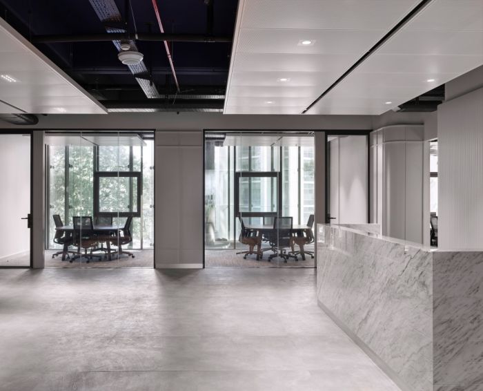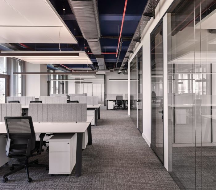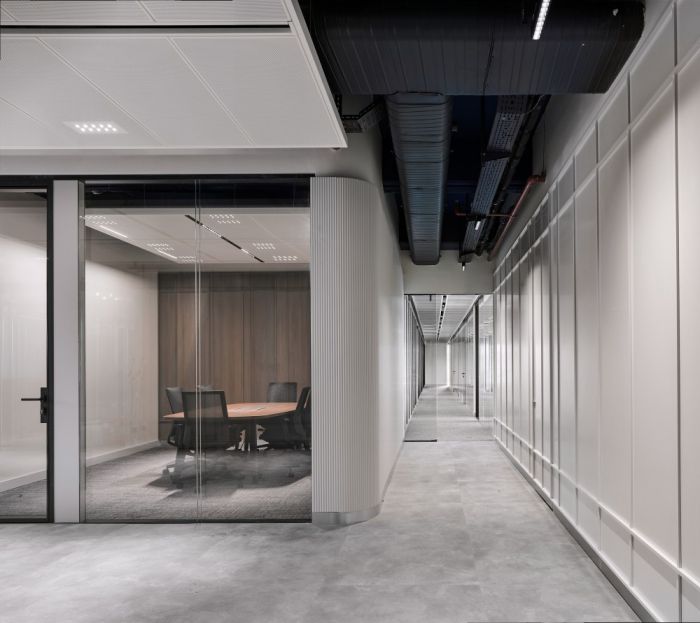 在該項(xiàng)目中,人力行政部門位于一樓;技術(shù)部門位于二、三樓。會議室和休閑區(qū)也根據(jù)需要布置在每一層。整體空間的白色調(diào)用于營造寬敞的氛圍。天花板被漆成深藍(lán)色,同時使用灰色調(diào)的技術(shù)設(shè)備,提供統(tǒng)一性。會議室和行政室的家具、柜臺以及儲藏室均采用定制,而開放式工作區(qū)則采用標(biāo)準(zhǔn)辦公家具。