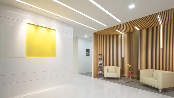 進門區域的設計:設計師在設計的時候,考慮到金融辦公室裝修的特性,并考慮到辦公現場的現狀,故此采用去前臺的設計手法,并在空間的斜對面加入了接待區域,這樣做的目的就是為了協調與前臺之間的關系,當客戶進入空間之后,整個空間呈夾角分布,指明了進入空間的路徑。