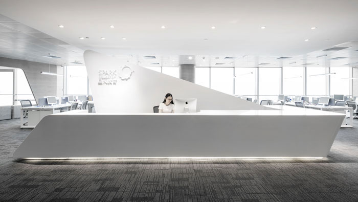 ? 前臺的設計:前臺給人的感覺好像從天而降一般,這也是因為整個空間呈開放式分布,設計師為了避免整個空間一覽無余,故此選用造型新穎、別致的前臺,這樣的前臺除了承擔起接待的任務,同時也要承擔阻隔的作用,在山尖處設計師將logo安置在此處,為企業(yè)的發(fā)展指明了方向。