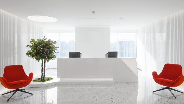 前臺(tái)的設(shè)計(jì):此處給人的第一感覺(jué)就是明亮、大氣,這也是設(shè)計(jì)師希望看到的,在設(shè)計(jì)師看來(lái)企業(yè)想要發(fā)展,就要在無(wú)時(shí)無(wú)刻之中注意企業(yè)的想象,設(shè)計(jì)師的想法就是從設(shè)計(jì)開(kāi)始,就追求極致的簡(jiǎn)約,給客戶留下一個(gè)不錯(cuò)的第一印象,仿真植物也為空間帶來(lái)勃勃生機(jī)。
