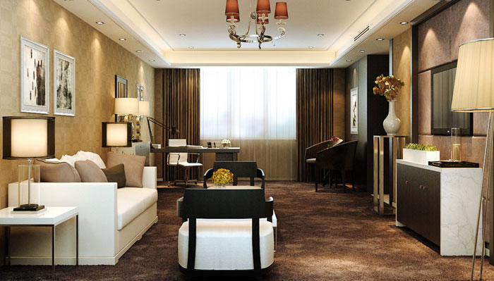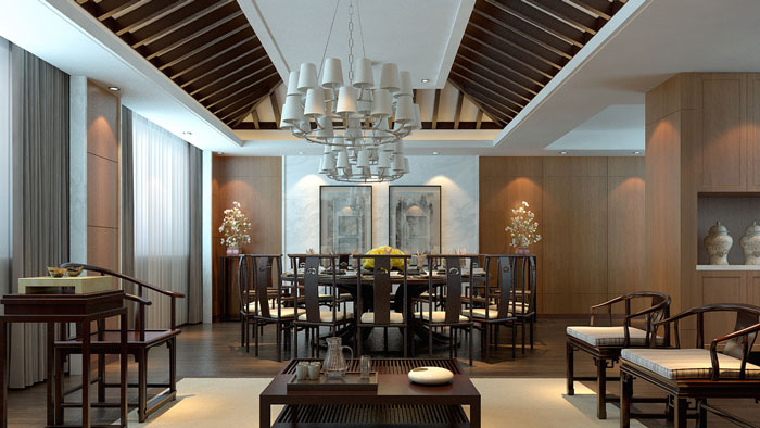 我們將致力于表現(xiàn)中國文化的意境與情趣,而非語言表象??侦`是中國文化特有的表征之一,在本案中,設(shè)計(jì)師通過大面處理,結(jié)合黑色鎢鋼線條,力圖體現(xiàn)中國明代的審美意味,家俱也由明式家俱改造提煉而成。