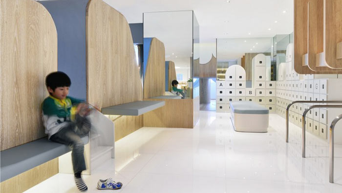 兒童教育培訓機構浴室設計:浴室內也有兩種高度的洗手臺,并設計成噴泉的形態,令家長和兒童共享同一種設施,進而培養更加親密的關系。
