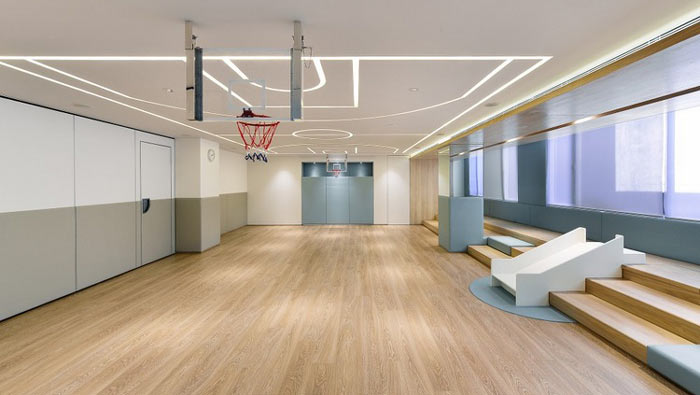 兒童教育培訓機構籃球場設計:孩子太小沒法學習籃球,沒關系在這里教育的不是成功投籃,而是培養孩子的興趣,在與隊員相互配合的同時,培養孩子們的團隊意識。