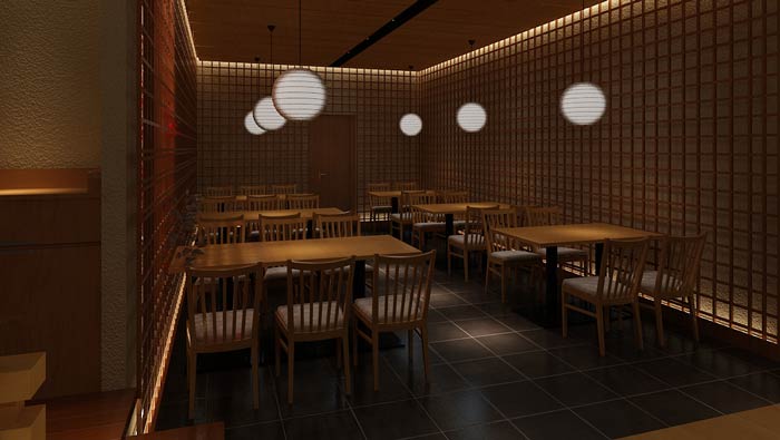 日本料理餐廳餐區(qū)設(shè)計(jì):這里由六人餐區(qū)、四人餐區(qū)構(gòu)成,六人餐區(qū)位于空間的左側(cè),四人餐區(qū)位于空間的右側(cè),依次遞進(jìn)的排列方式,是為了保證空間的和諧。