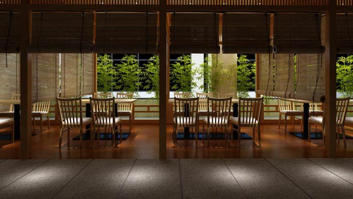 日本料理餐廳過(guò)道餐區(qū)設(shè)計(jì):竹子為空間帶來(lái)了一絲綠色,整個(gè)空間看起來(lái)郁郁蔥蔥,下雨天的時(shí)候,客戶在這里吃飯、聊天,看著室外的雨水,也是一個(gè)不錯(cuò)的享受。