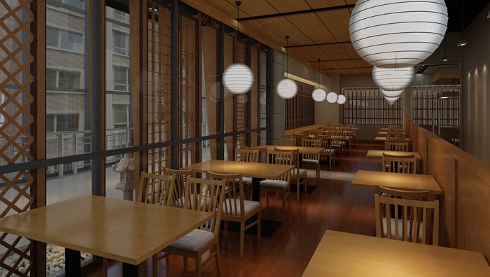 日本料理餐廳過(guò)道餐區(qū)設(shè)計(jì):這里是室內(nèi)與室外的交匯處,客戶在這里就餐可以享受到自然風(fēng)、享受到自然的陽(yáng)光,在這里與自然是那么的近,在這里讓客戶感受到一種安寧。