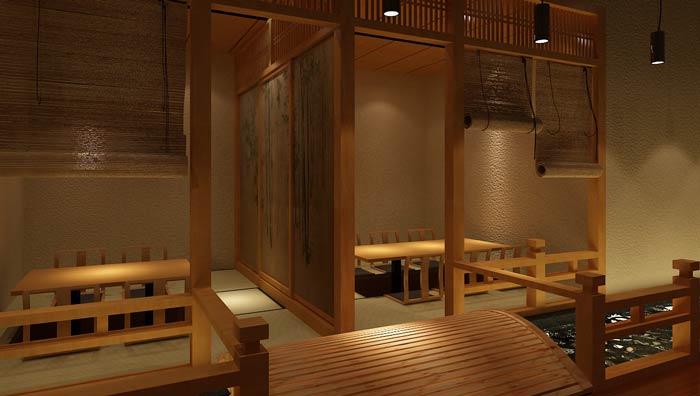 日本料理餐廳包廂設(shè)計(jì):包廂位于水流的一邊,流水從包廂的門(mén)口流過(guò),讓空氣格外清新,拱橋的設(shè)計(jì)讓人仿佛回到了過(guò)去,在這里客戶將享受到不一樣的就餐環(huán)境。