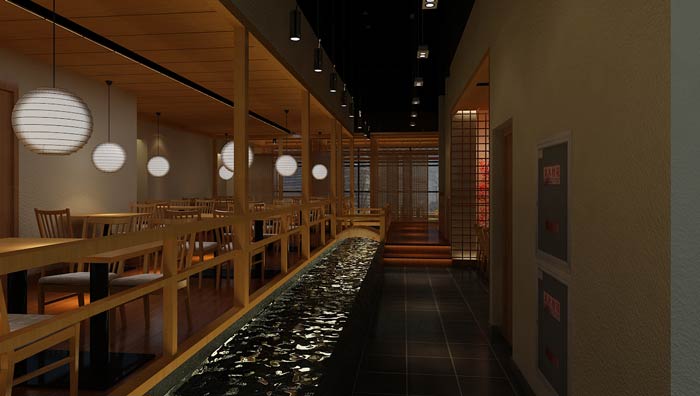 日本料理餐廳吧臺(tái)設(shè)計(jì):師傅把制作好的壽司,放在盤(pán)子后擺在運(yùn)輸帶上,運(yùn)輸帶圍繞餐廳的坐臺(tái)而行,顧客可隨意食用,用膳后,店員依照顧客桌上的盤(pán)子而結(jié)算帳單。