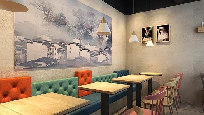 飲品小吃店餐區(qū)裝修設(shè)計(jì):兩人區(qū)、四人區(qū)相互搭配在一起,兩人區(qū)位于內(nèi)部、四人區(qū)位于外部,客戶一邊吃著卷餅,一邊喝著飲品,背后鄉(xiāng)村的墻畫(huà),讓我們仿佛回到了過(guò)去那個(gè)簡(jiǎn)單的年代。