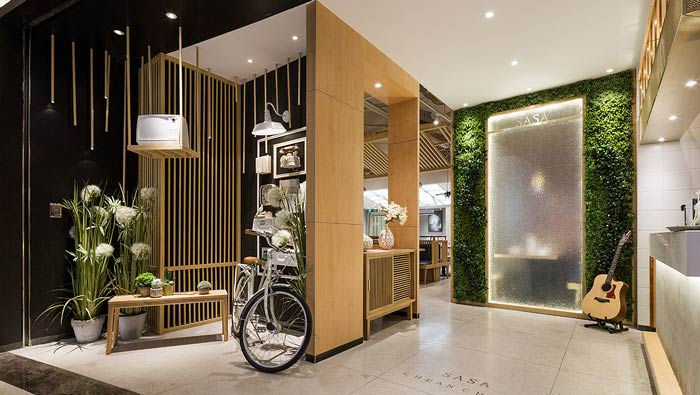 小吃店進(jìn)門(mén)區(qū)裝修設(shè)計(jì):盆栽為空間帶來(lái)了綠色,自行車為空間帶來(lái)了行動(dòng)力,吉他為空間帶來(lái)了音樂(lè)氣息,一切的一切都旨在改變?nèi)藗兊挠^念,讓客戶在這里享受傳統(tǒng)美食。