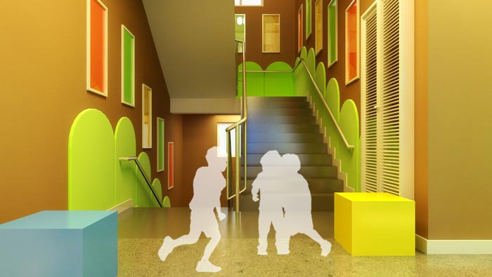 樓梯間的設計:設計師的想法就是空間處處可玩耍,在設計師看來孩子的想法是千奇百怪,同時也是純真無比的,設計師希望盡可能的滿足屬于他們的天性,讓孩子在玩耍的過程中可以不斷地成長,在安全方面防滑地面也保證孩子在玩耍時的安全問題。