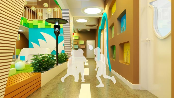 前臺的設計:當家長帶著孩子來到此地的時候,進入空間第一眼看到的就是綠油油的自然景觀,這是設計師繼承了戶外的設計特色,自然地向內(nèi)延伸,讓人不會感到突兀,設計師的想法就是讓孩子進門就看到一個五顏六色的世界,滿足孩子濃重的好奇心,讓孩子一眼就喜歡上這里。