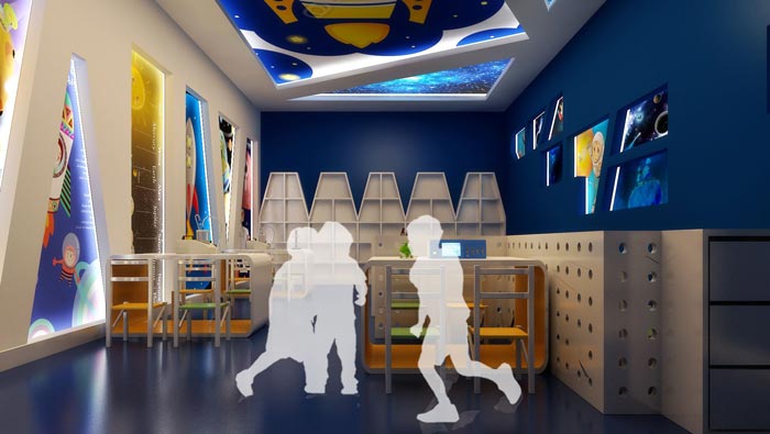 科幻教室的設計:在這里可以引發(fā)孩子們的聯(lián)想,相信大家在小時候都喜歡幻想,在設計師看來聯(lián)想與幻想就是搭配得當,對于人的成長十分有好處,故此設計師采用高科技打造一個立體式的科幻空間,讓孩子在這樣的空間中好奇心得以滿足,并以此為起點引發(fā)孩子對未來探索的興趣。