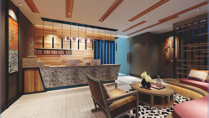 前臺的設計:第一眼給人的感覺就是溫馨,在設計師看來空間面積在于精不在于大,設計師希望一改人們普遍的認知,就是酒店前臺十分巨大的現狀,設計師認為這里給人的第一感覺就是遠離都市,那么以往的設計經驗都不適合這里,故此設計師在此地停留了很久,目的就是尋找到此處歷史的痕跡。