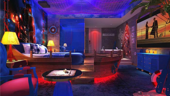 海盜船客房的設計:此處說起來是海盜船,但是設計師的取景不同,設計師取得不是人物,而是夜晚美麗的景色,在漫漫大海中我們隨風飄蕩,頂部好像夜晚降臨的星空,在這里我們相互依偎,在這里我們看著彼此,在這里我們聽著海洋、星空的祝福,這不正是我們期待的浪漫星空。