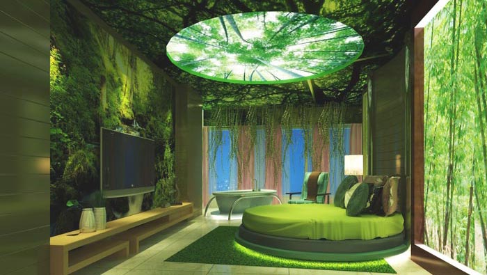 海底客房的設計:對于海底相信每一個人都充滿了好奇,設計師也不例外,故此此地是設計師為了滿足大家的好奇之心而特意設計的,頭頂月光投影在海面之上,我們躺在床上仿佛置身于海底,魚群從我們身邊游過,讓我們的思緒與魚群一起擺動,感受那不曾感受過的神奇。