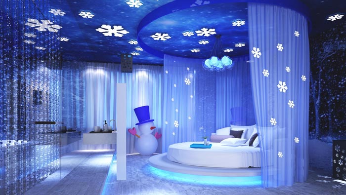 瑞雪客房的設計:正所謂瑞雪兆豐年,這是古代先賢總結的自然規(guī)則,其中包括了雪的重要性,我們躺在床上雪花隨風飄揚而下,讓我們仿佛置身在大雪紛飛之中,一旁雪人為我們站崗放哨,此處不管是夏季還是冬季,對于客戶來說都是一個不錯的場所,讓我們在此地見證大自然的神奇與美麗。